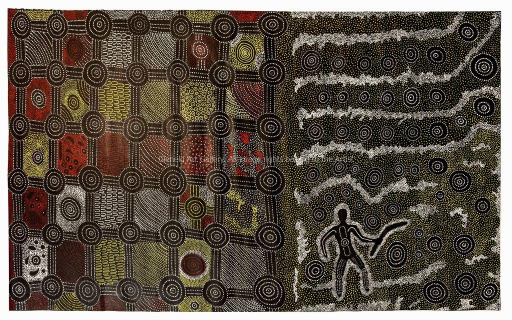 “We are born with everything we need. It is all around us. We have fire, water, hunting, shelter, tools, animals, plants, winds. Plenty to satisfy everything and be happy” Stephen shows us. All these things are celebrated in Stephen’s strong Spirit Man’s paintings. There is an appreciation here too of strong male figures – resourceful reliable men are very important role models in all societies and play an crucial role in the structure of Aboriginal societies’ Culture, securing independence, respect for self & others of safe lifestyle choices.